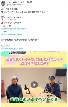 志らくはこの日、「志らくさん!信子に面白い話を聞かせてください」番組イベントの告知を引用。同イベントは、「ぱーてぃーちゃん」信子とともに「志らくがみんなに話したいニュース2024年総まとめ」を語る。