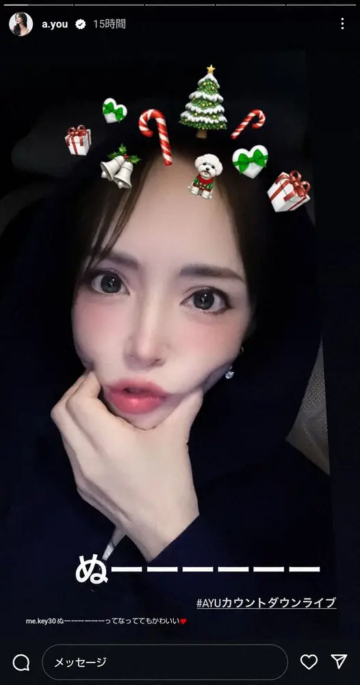 浜崎はクリスマスツリーや犬の絵文字などとともに「ぬーーーーーー」とコメント。口元を手で押さえた“変顔”写真を披露した。