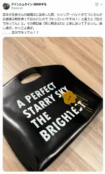 するとてつじは「自分で作ってん」と、まさかの"オリジナル作品"だったことを告白。そして後日てつじから自宅にバッグが送られて来たと打ち明け、「嬉し過ぎ。かっこよ過ぎ」と感激。しかし「、、、自分で作ってん!?」と改めて驚きつつ、バッグの写真を公開した。
