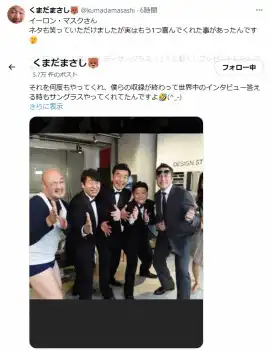 くまだは「イーロン・マスクさん ネタも笑っていただけましたが実はもう1つ喜んでくれた事があったんです」といい「イーロンさんに僕のダンディサングラス(上下に動く)プレゼントしたんです それを何度もやってくれ、僕らの収録が終わって世界中のインタビュー答える時もサングラスやってくれてたんですよ(^_-)」と秘話を明かした。
