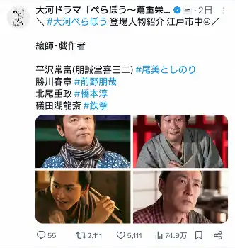 来年放送のNHK大河ドラマ「べらぼう~蔦重栄華乃夢噺~」の公式X(旧ツイッター)が19日までに更新され、出演者たちの劇中衣装での写真を投稿。