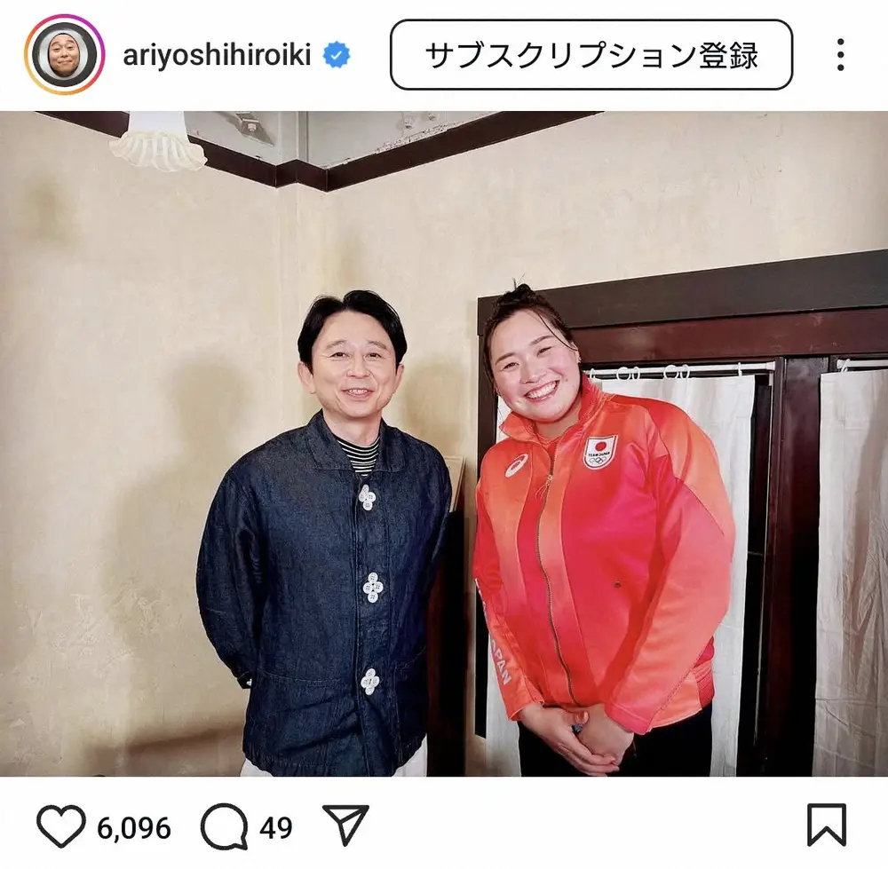 お笑いタレント・有吉弘行(50)が20日、自身のインスタグラムを更新。陸上女子やり投げのパリ五輪金メダリスト・北口榛花(26=JAL)との2ショットを披露した。