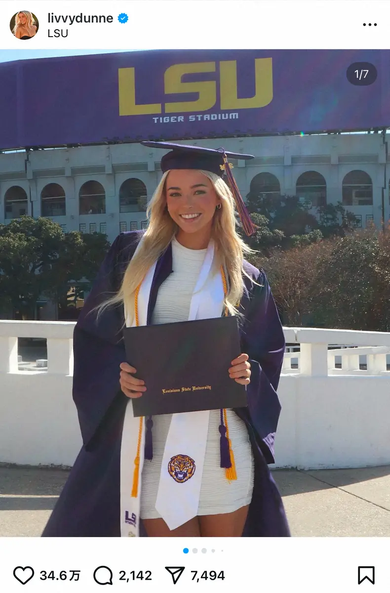 「Forever LSU(ルイジアナ州立大の略称)」とつづったダン。ぴったりとした白のドレスにアカデミックガウンを羽織り、角帽をかぶった笑顔の自身の写真をアップした。