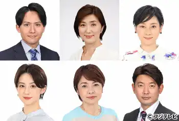 フジテレビの(上段左から)安宅晃樹、佐々木恭子、島田彩夏 (下段左から)宮司愛海、西山喜久恵、谷岡慎一アナウンサー(C)フジテレビ