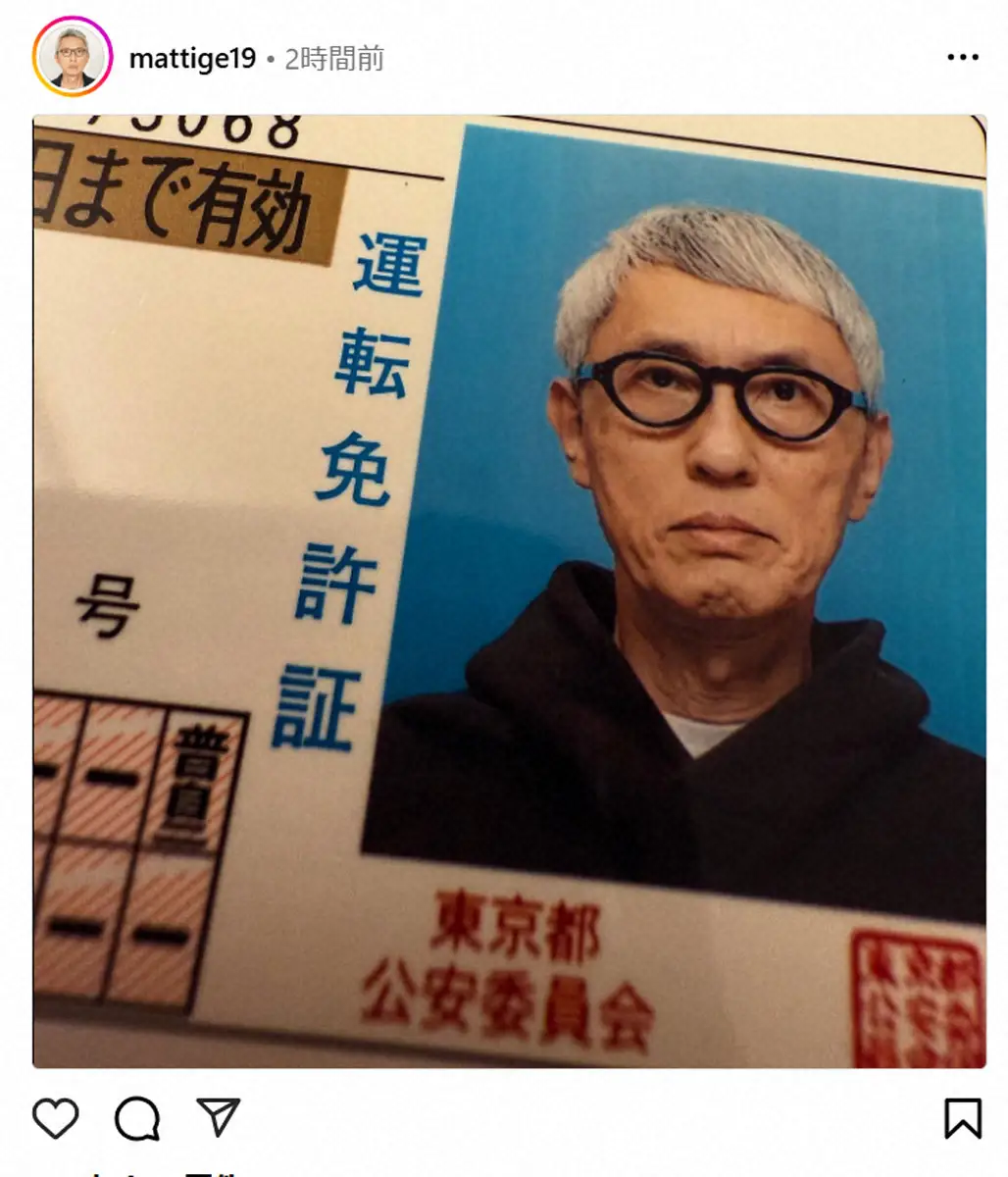 白髪に黒縁メガネをかけ、黒のパーカ姿の運転免許証の写真を公開。「あと何回更新できるか考えると、大事に車に乗ろうと思うよ」と、しみじみとつづった。