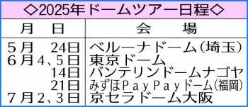 11月の福岡を皮切りに名古屋、東京から大阪へと渡り歩いた7回目の単独ドームツアーで9公演。大阪での3日間で計12万人を動員した。ここから5カ月後に8回目の全国ドームツアーに臨む。来年5月24日の埼玉・ベルーナドームでスタート。東京、愛知、福岡、大阪の5都市で計7公演となる。