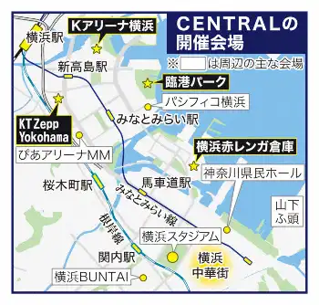 主催するCENTRAL実行委員会によると、会場はKアリーナ横浜とKT Zepp Yokohamaの屋内2会場、赤レンガ倉庫と臨港パークの屋外2会場。今後、さらに増える見通しで、横浜の街全体を巨大なフェス空間とする、海外でも類を見ない異例の規模だ。来年4月4~6日の3日間開催される。