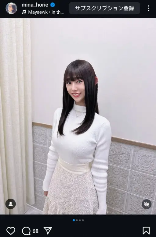 「なぜか、耳が赤い、、、?髪の毛、可愛くしてもらいました 美髪矯正で、もれなく艶々ふわふわヘアーです @lewinxiaochi 初めましてでしたがじっくりと顔とのバランスを見ていただき素敵に仕上げてくださいました!ありがとうございます」とつづり、白のタートルネック&スカート姿の黒髪ショットをアップした。