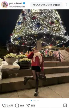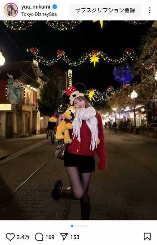 「シーの街並みがとっても可愛くてどこで写真撮ってもキラキラでした いっぱい写真撮ったから何回か投稿しよっかな」とつづり、赤のアウター、黒のショートパンツ、ミニーのカチューシャ姿で、ディズニーシーのクリスマスイルミネーションをバックにした写真などをアップした。