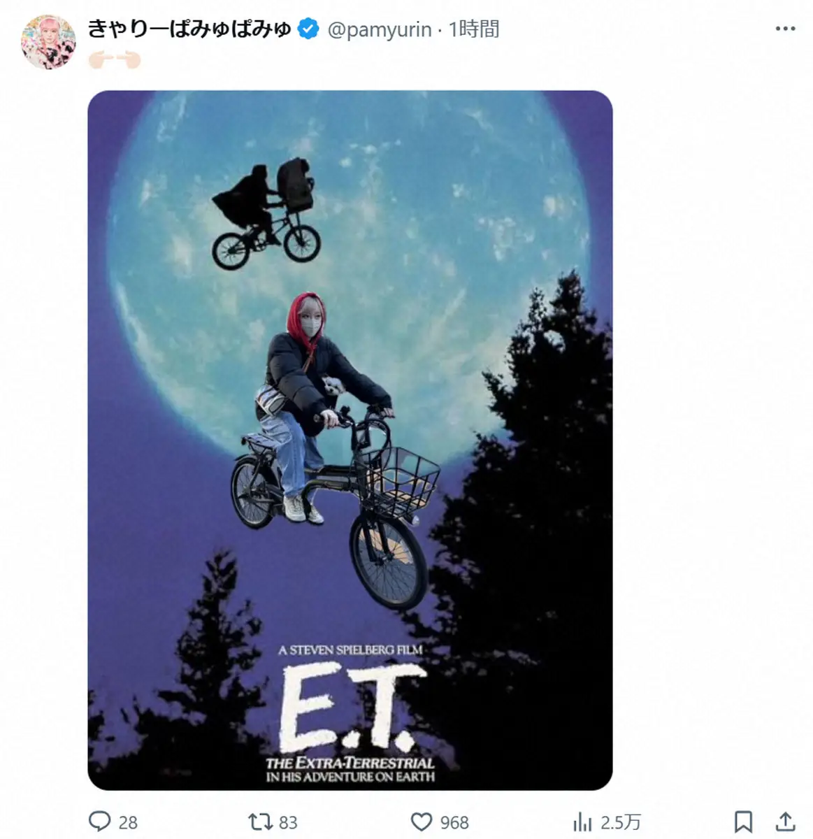 歌手のきゃりーぱみゅぱみゅ(31)が24日、自身のX(旧ツイッター)を更新。82年公開の映画「E.T.」のなりきりショットを公開した。