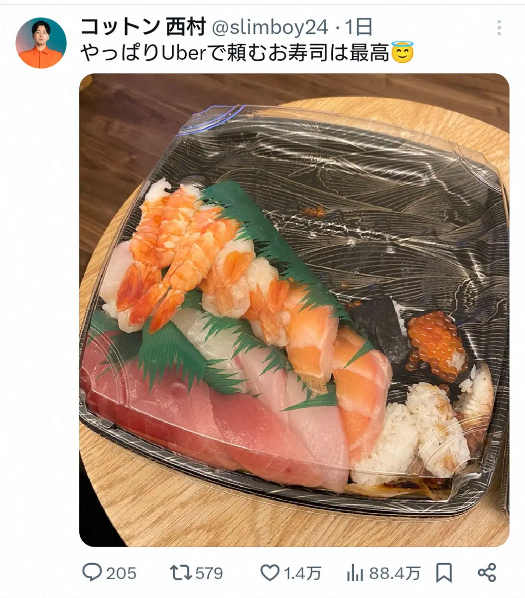 「コットン」西村真二 Photo by スポニチ コットン西村真二がデリバリーで届いた寿司がまさかの状態 「これ来たら… ギャラリーで見る この記事のフォト 2024年12月25日の画像一覧 もっと見る 2024年12月25日の画像をもっと見る