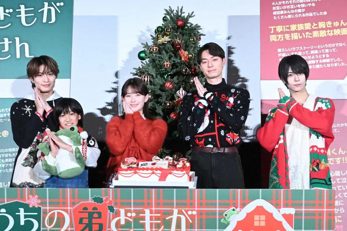 映画「うちの弟どもがすみません」成田家スペシャルクリスマスパーティーに出席した(左から)那須雄登、内田煌音、畑芽育、作間龍斗、織山尚大(撮影・糸賀日向子)