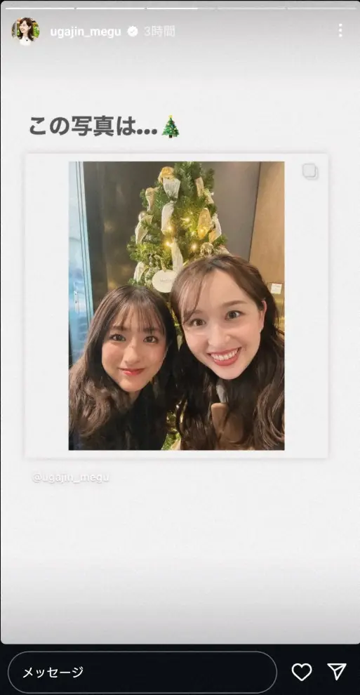 自身のインスタには、「クリスマスいろいろ 皆さま良いクリスマスを」とつづり、“現在”の写真などをアップ。フォロワーらからは「綺麗な宇賀神メグさん 可愛い田村真子さん」「癒されます!」「お2人とも綺麗」「素敵です」「本当仲良しなTBSのエース女子アナ!」などの声が寄せられている。