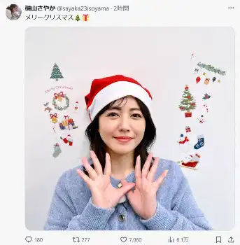タレントの磯山さやか(41)が25日、自身のX(旧ツイッター)を更新。サンタ帽をかぶった姿を公開した。