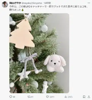 24日の投稿ではツリーの写真を投稿。「今年は、この前UFOキャッチャーで一回でゲットできた愛犬に似てるコを、飾りました」と愛犬リリーにそっくりな犬のキーホルダーを飾ったこともつづっていた。