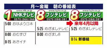 改編はNHK連続テレビ小説へ対抗するのが狙いだ。現在「めざましテレビ」は午前8時までだが、朝ドラはそこから15分間放送している。局関係者は「これまで『めざましテレビ』が終了すると同時に視聴者が朝ドラへとチャンネルを変えてしまい、『めざまし8』へとうまくバトンを渡すことができなかった。それを解消するための改編となった」と説明している。
