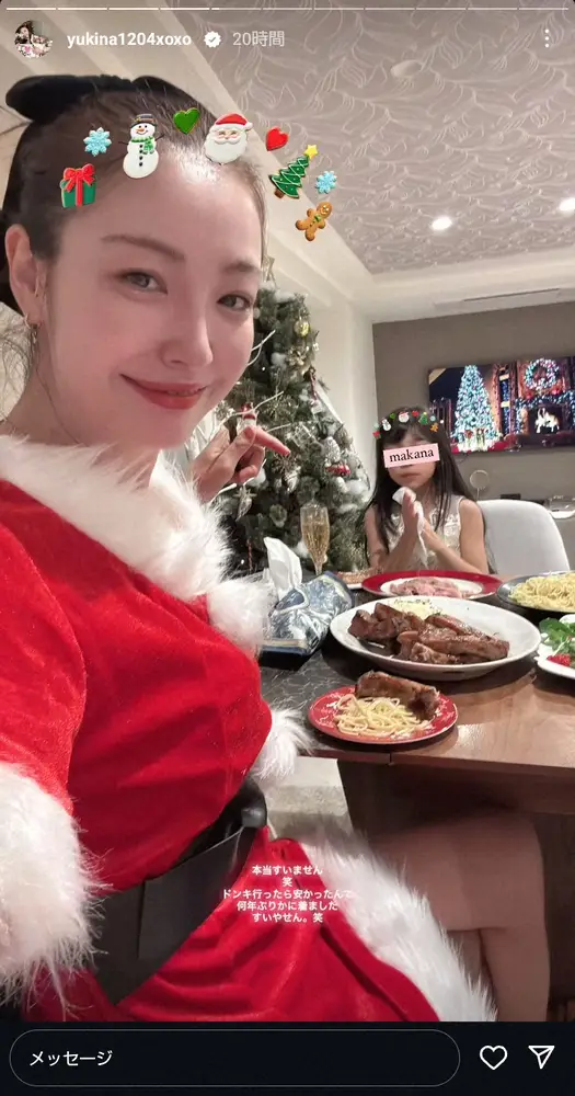 またストーリーズでは「本当すいません笑」と断り、「ドンキ行ったら安かったんで何年ぶりかに着ました すいやせん。笑」とサンタクロースのコスチューム姿の写真を掲載した。