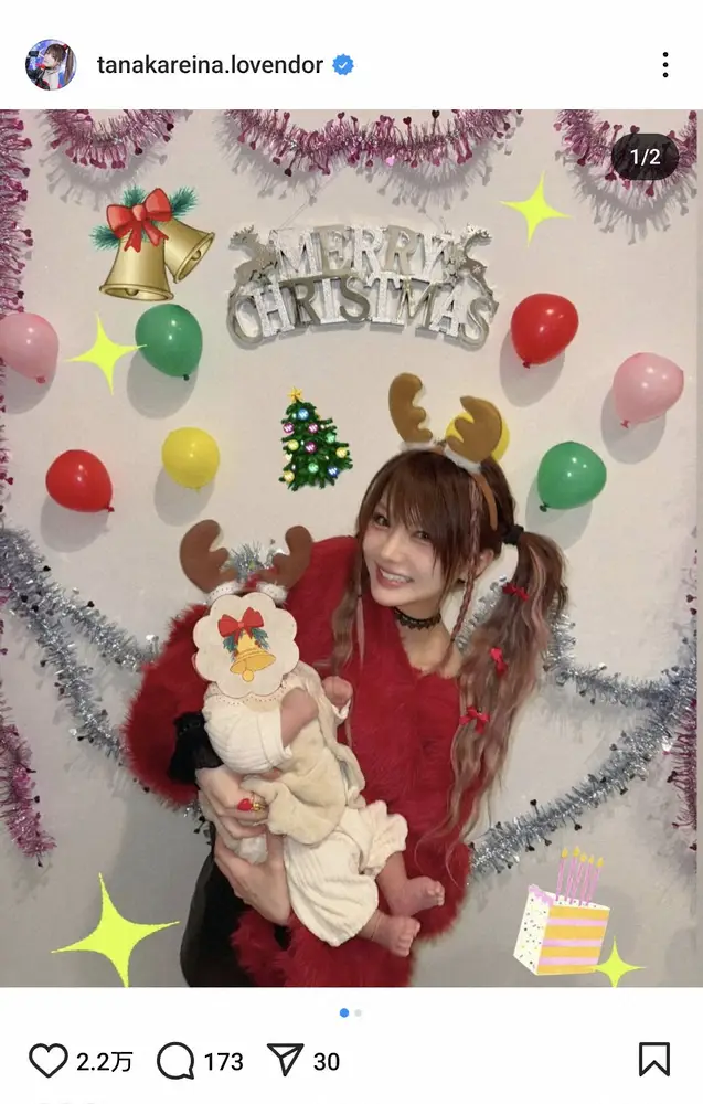 田中の投稿に、フォロワーからは「可愛いぞ」「赤ちゃんにとっては初クリスマスだね れいなも楽しそう」「ルンルン」「息子ちゃんとれーなメリクリ 2人とも可愛い」「素敵です」といった反響が寄せられている。