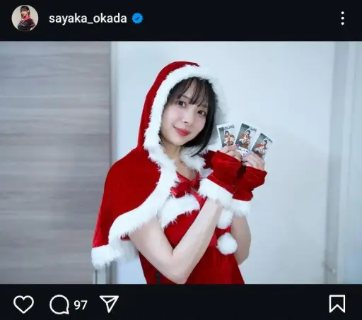 「クリスマスだねぇ おかサンタよりチェキのプレゼントがあります YouTubeを見てくださいな」とつづり、サンタのコスチューム姿でチェキ写真を手にしているショットをアップした。