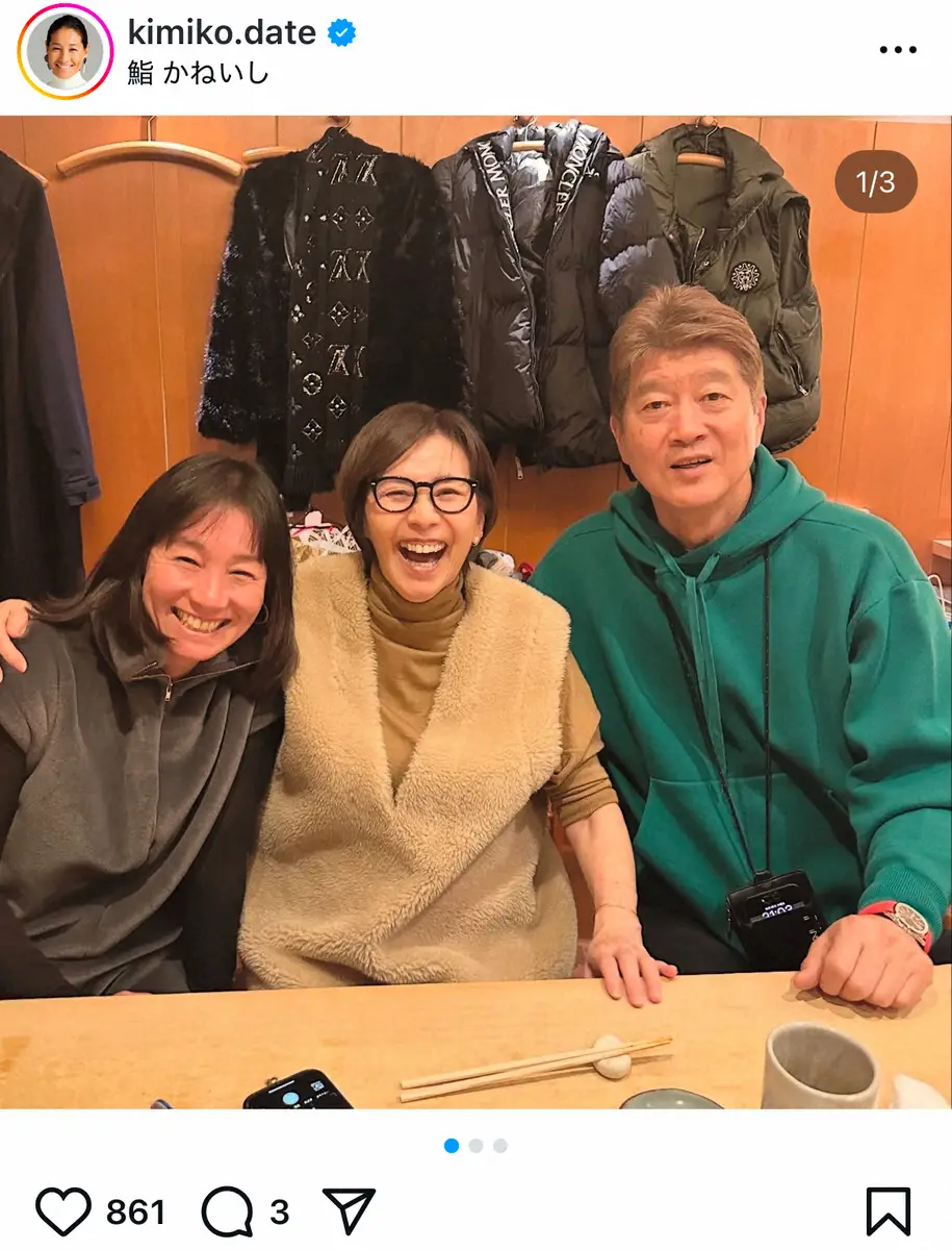 伊達さんは「もう2日前のクリスマス 夜は(陣内貴美子)さん (金石昭人)さんお店 『鮨かねいし』へ クリスマス 会えるお友だちっていい!」とつづり、バドミントン元五輪代表でキャスターの陣内貴美子と、その夫で元プロ野球選手の金石昭人さんと撮影した3ショットをアップ。金石さんが営む寿司店「かねいし」でクリスマスに食事したことを伝えた。
