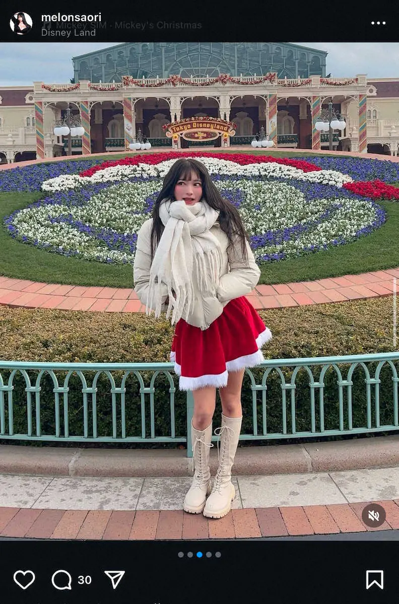自身のインスタグラムでは「久しぶりのディズニーランドでルンルンメロンちゃん。モコモコマフラーコーデ」と生脚クリスマスコーデ姿を投稿した。