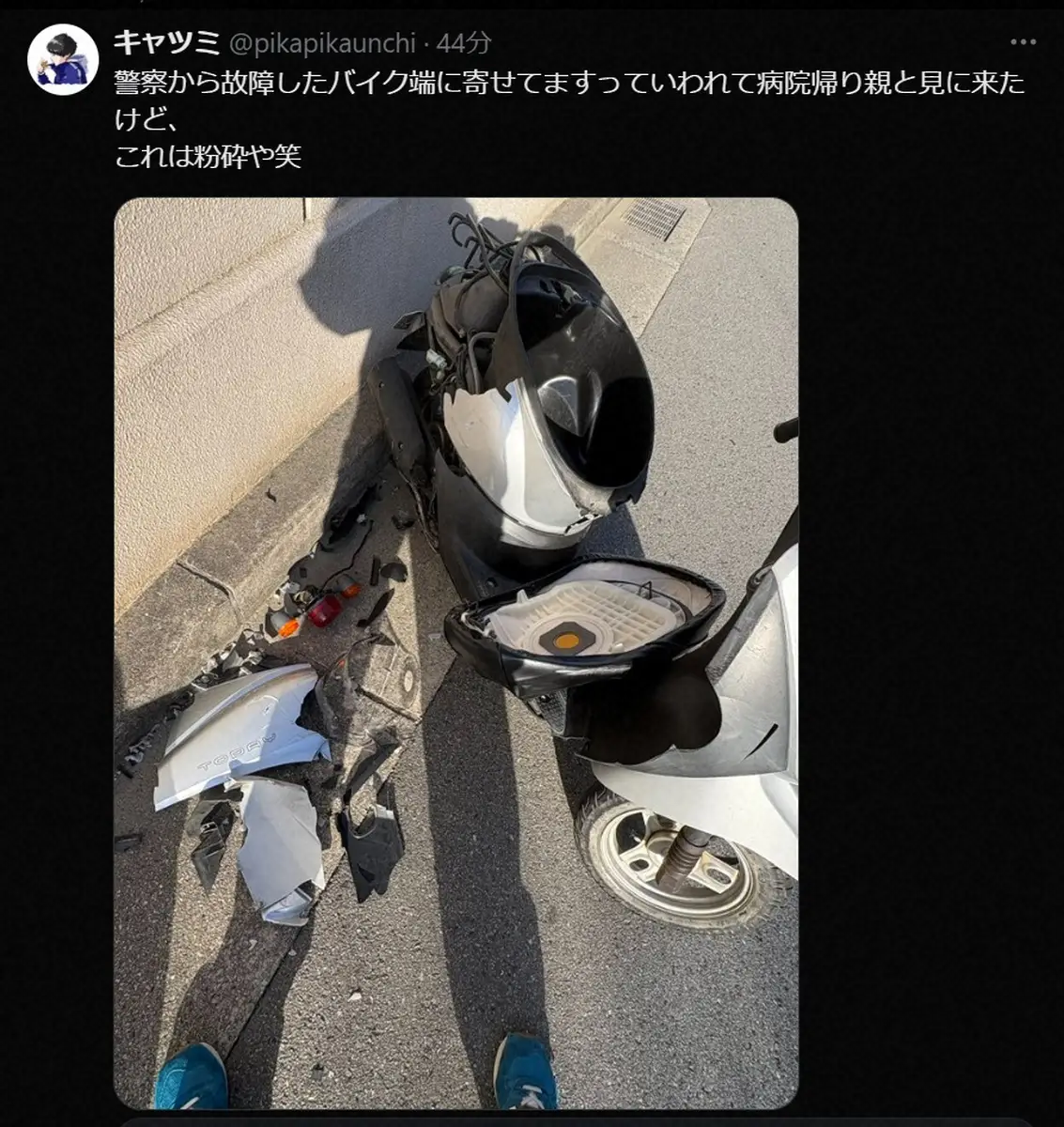 「警察の方が車とバイクを見て、生きてることと骨折がないことに驚愕してた!」と、命に別状はなかったようで「なんか受身がとてつもなく上手いらしい 俺すげぇワラ」とつづった。