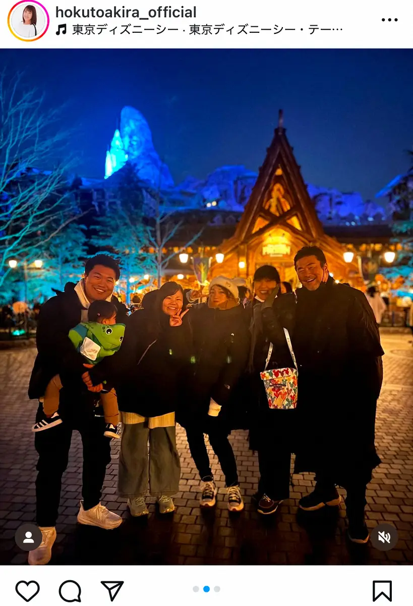 北斗は「時差投稿になりますが 仕事納めも終わり 昨日は、孫孝行の為に 家族揃って(友達も一緒にね~) ディズニーシー に行って来ました~」と投稿。夫の佐々木健介、長男の佐々木健之介さんとその妻・凛、そして孫でテーマパークを楽しんだことを振り返った。