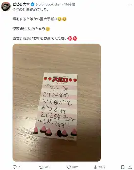 お菓子の「アポロ」のメモにしたためられた娘の置き手紙の写真を投稿。「ダディーへ 2024年のおしごとおつかれ 2025年もがんばってね!!」と書かれており、「皆さまも良いお年をお迎えください」と締めくくった。