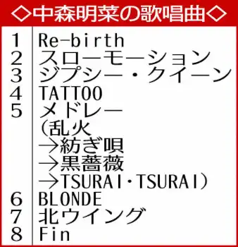 「あっき~な~」のコールと手拍子に導かれて登場した中森。白と黒のフリルがついた上着に白のパンツ姿。「ご無沙汰しております」とあいさつし、三方に礼をして投げキスをすると万雷の拍手が巻き起こった。「Re―birth」から約1時間のライブがスタート。「ちょっと緊張しています…」と語る、か細い声と裏腹に、ライブでは力強い歌声を披露した。