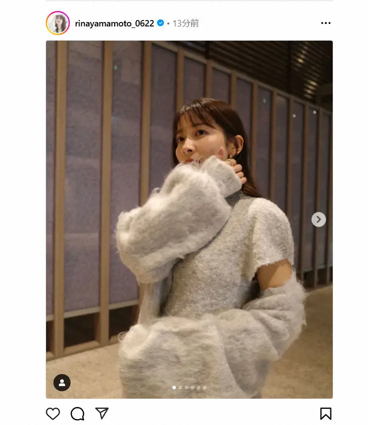 山本は「モコモコなワンピースを着て主人とちょっと遅めのクリスマス忘年会」と記し。白いニットワンピースを着た最新ショットを公開。「デートにぴったりでした」とのろけた。