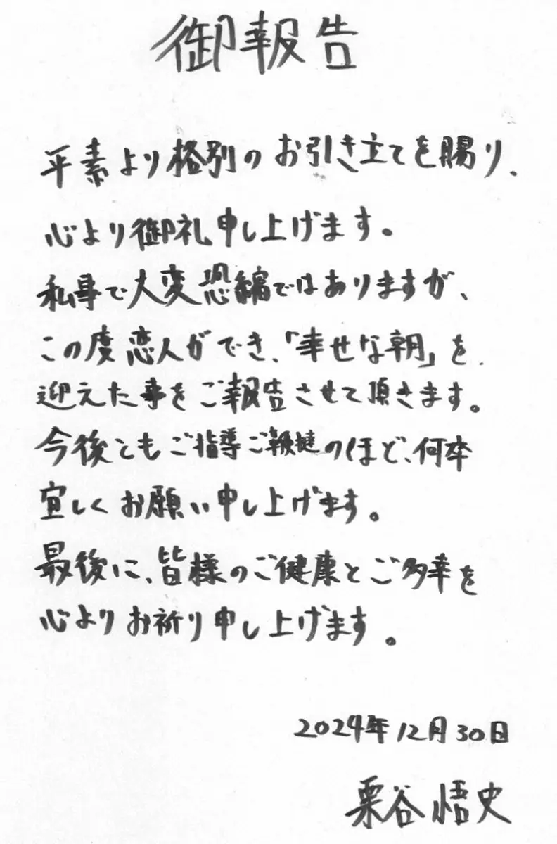 カカロニ・栗谷インスタグラム (@kuritanikakarony)から カカロニ栗谷に“初恋人”直筆書面で「幸せな朝を迎えた」“卒業報告”まさか… ギャラリーで見る この記事のフォト 2024年12月30日の画像一覧 もっと見る 2024年12月30日の画像をもっと見る
