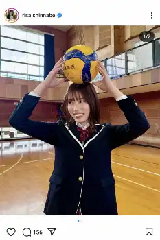 「もう着ることないと思ってた制服着て、教室でテストして、学生気分味わえて楽しかった~」と書き出すと、紺色のブレザーに白のブラウス、赤のリボン姿でバレーボールを掲げるショットをアップ。