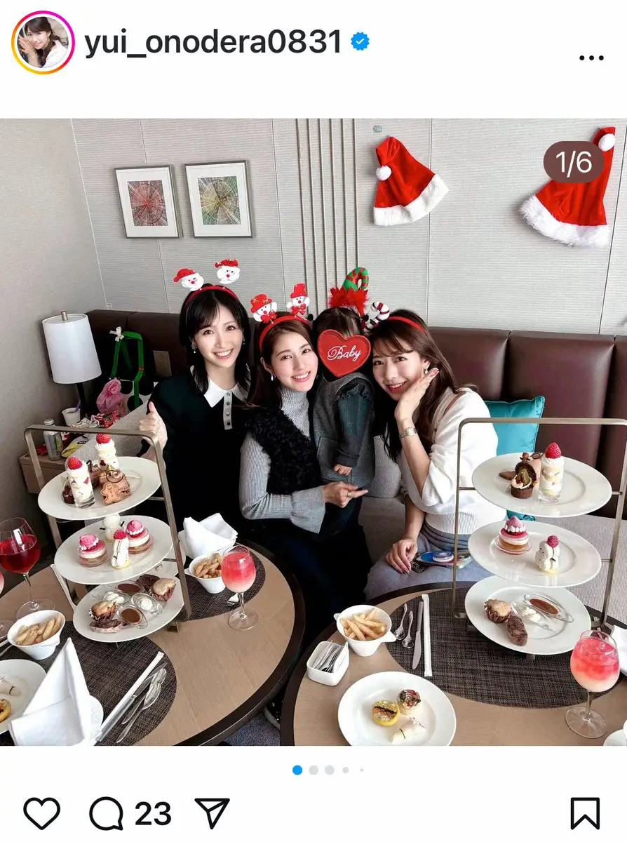 フリーアナウンサーの小野寺結衣(33)が30日、自身のインスタグラムを更新。同じ年の仲良しアナたちとのクリスマスパーティーショットを披露した。