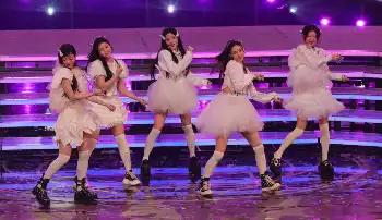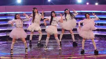 真っ白な衣装に左胸に喪章をつけて登場したILLIT。チュールたっぷりのミニスカートに白のニーハイソックスでキュートにパフォーマンス。歌唱前には司会の有吉弘行に振り付けのポイントを指導する場面もあった。