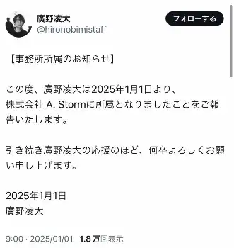 2.5次元俳優・廣野凌大 事務所所属を発表「株式会社A.Stormに所属となりました」