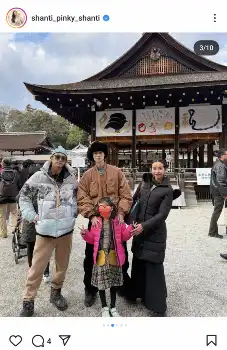 「新年あけましておめでとうございます」と書き出すと、橋をバックにした自身と洋介の夫婦ショットや、神社の境内での自身と洋介、長男で俳優の愛流、7歳長女との家族ショットなどをアップ。