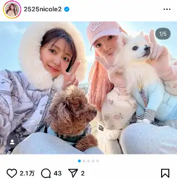 藤田ニコル 仲良しの2世モデルと“犬会” おそろいの洋服で散歩に「最上級の癒し」「みーんなかわいい」