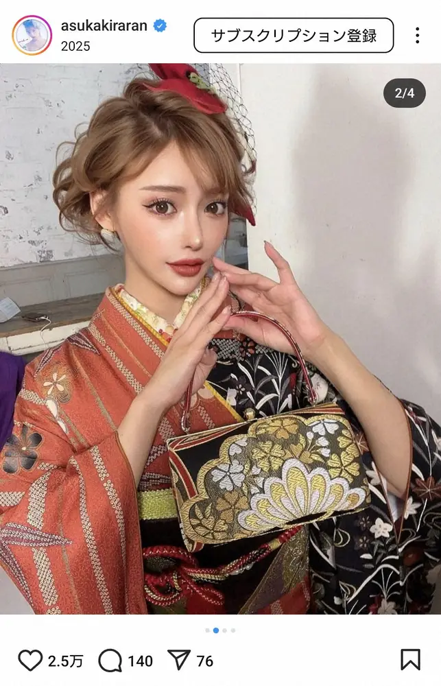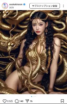 明日花の投稿に、フォロワーからは「金の蛇の女神様、金運アップしそうですね」「素敵すぎ」「めっちゃ綺麗」「ヘビ通り越して龍になってる」「美し過ぎる!」「超美」といった反響が寄せられている。