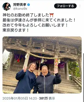 狩野英孝のX(@kano9x)から 狩野英孝 実家の神社を仲良し先輩芸人が訪れたと報告に「なんかめっちゃ… ギャラリーで見る この記事のフォト 2025年01月05日の画像一覧 もっと見る 2025年01月05日の画像をもっと見る
