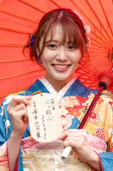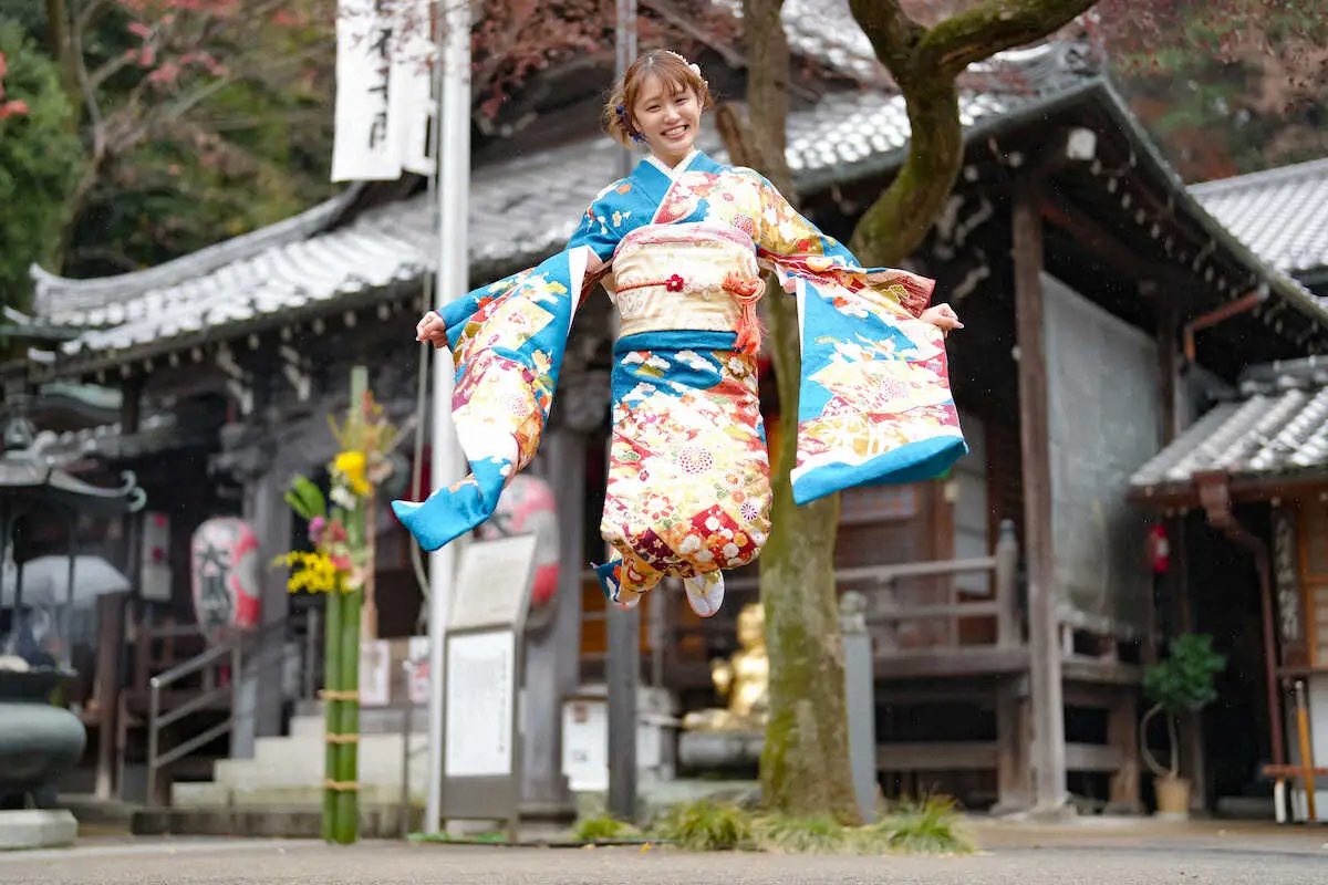 小雨が降る中、境内では晴れ着姿では晴れ着のまま華麗なジャンプを披露。高校までバレーボールに励み、国体候補にも選出された経歴も。当時からジャンプ力には定評があったといい「跳ぶことは自信があります。広島一のジャンププレーヤーを目標にしていたので」と胸を張ったが「かわいく跳ぶことよりも高さに意識がいっちゃって…顔が心配です」と苦笑いした。