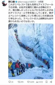 野口健氏 Photo by スポニチ 野口健氏 エベレストの登山者の増加、ゴミ問題に警鐘「極めて危険なアイ… ギャラリーで見る この記事のフォト 2025年01月08日の画像一覧 もっと見る 2025年01月08日の画像をもっと見る