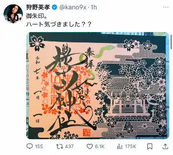 お笑い芸人の狩野英孝(42)が8日までに自身のX(旧ツイッター)を更新。実家の神社の御朱印の“粋な仕掛け”を明かした。