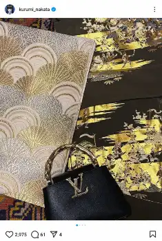 そして帯の柄についても解説し、「今回は両方ともメルカリで見つけました 色々思考しながら探すのはとても楽しい作業です」と告白。ハイブランドのバッグと合わせた写真を添えて「着付けは自分で行いました!」と明かし、「着物は四角く畳んでスーツケースに入れられるし、着るととても喜んでもらえるのでパーティーの場にもってこいですね」とつづった。