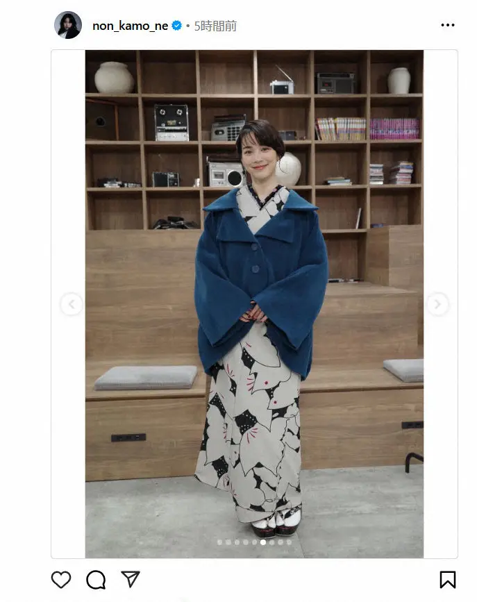 のんは「着物も髪のフォルムも最高。大正ロマンなムードです。青いコートは高校生の時に買ったSLYの、よく着てた。かわい」とつづり、着物姿の最新ショットを披露。