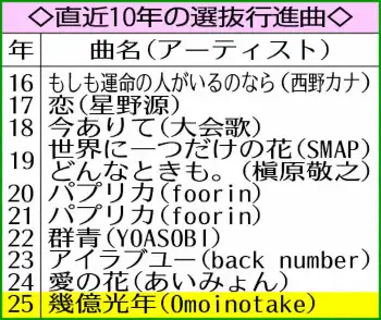 直近10年の選抜行進曲 Photo by スポニチ Omoinotake 「幾億光年」がセンバツ入場行進曲に決定 日本高野連が発表 ギャラリーで見る この記事のフォト 2025年01月11日の画像一覧 もっと見る 2025年01月11日の画像をもっと見る