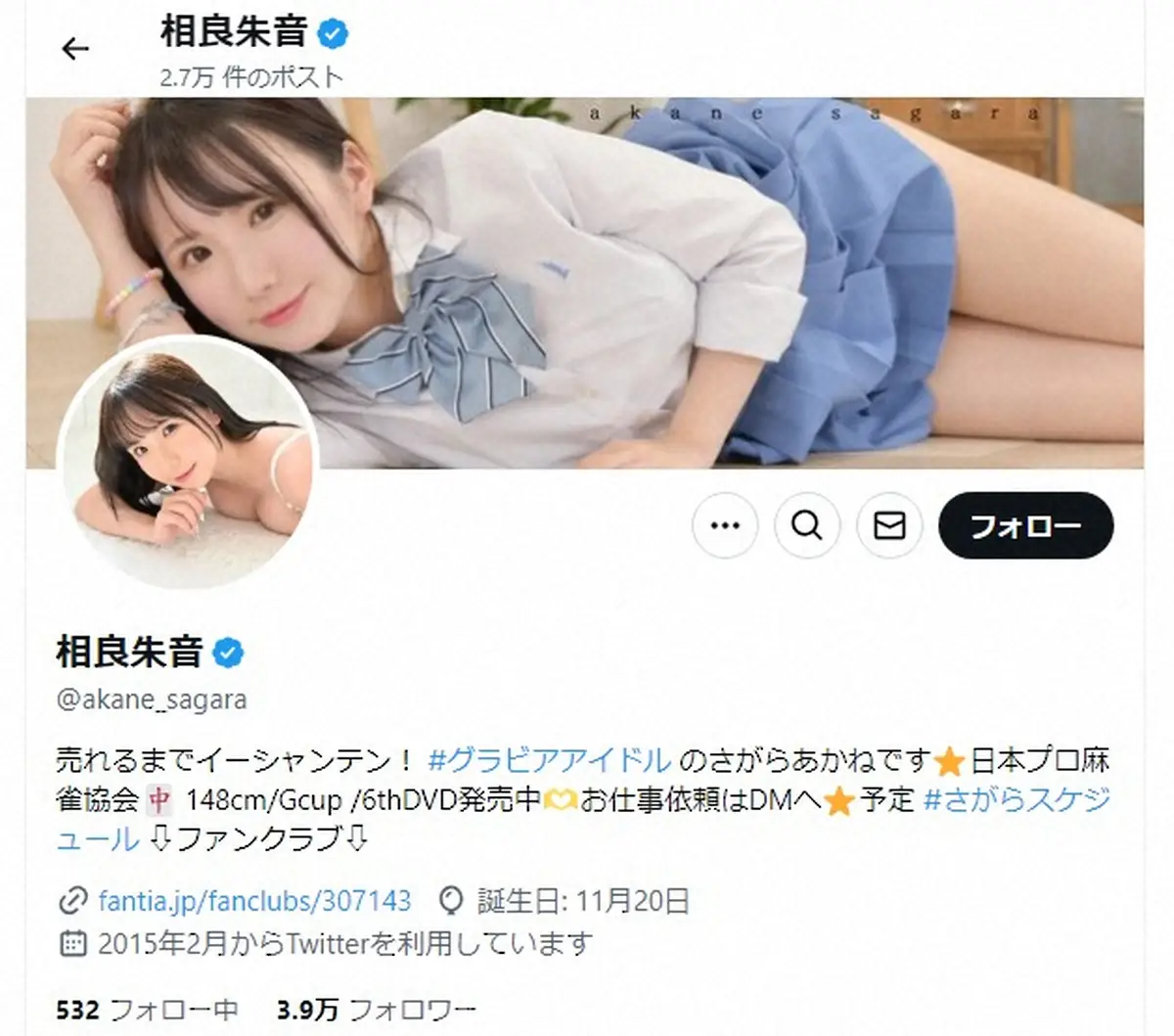 グラビアアイドルで日本麻雀協会にも所属するタレント・相良朱音の公式X(@akane_sagara)から