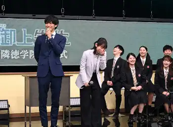 歌の冒頭では、生徒たちの姿を記念に残そうと携帯で撮影を行っていた吉岡だったが、生徒たちの澄み渡った歌声と、美しいハモりに思わずウルウル。歌唱後には笑顔で拍手し、生徒たちを称えた。