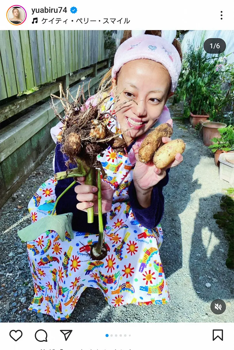 「家族と過ごす時間はメイクもネイルもアクセサリーも全部取り払って、あなたはどなたですか?状態 ありのままで土いじり 東京でも完全オフの日はすっぴんゾンビだけど 育ててるお野菜やフルーツや草花の成長が嬉しい 今回はじゃがいも、里芋、肉厚ピーマンの収穫 エプロン大丈夫そ?パジャマ大丈夫そ?すっぴん大丈夫そ?ヘアバンド大丈夫そ?」とつづった。