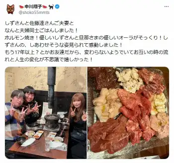 タレントの中川翔子が13日、自身のX(旧ツイッター)を更新。人気芸人夫妻と食事をしたことを伝えた。