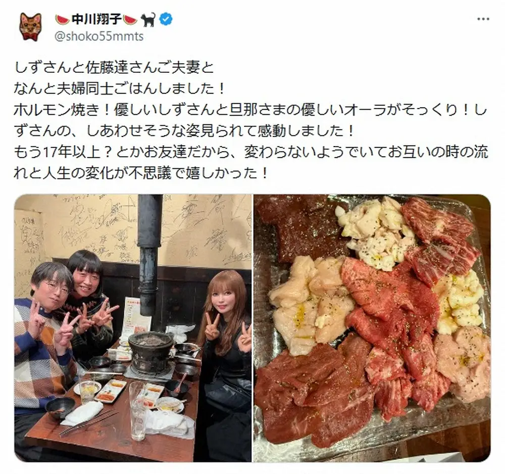中川は「しずさんと佐藤達さんご夫妻となんと夫婦同士ごはんしました!」と報告。「ホルモン焼き!優しいしずさんと旦那さまの優しいオーラがそっくり!しずさんの、しあわせそうな姿見られて感動しました!」と伝えた。